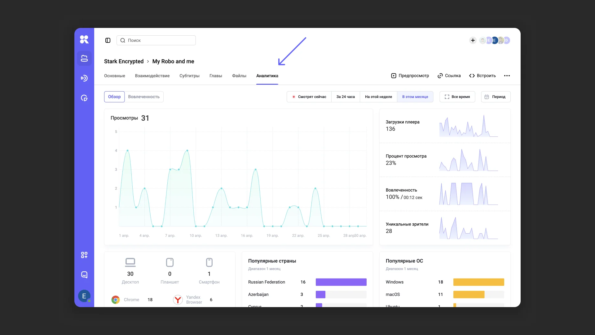 Инструменты аналитики Kinescope позволяют отслеживать просмотры, вовлечённость, популярность контента, географию и поведение аудитории. С аналитикой проще оптимизировать стратегии работы с видео и быть ближе к зрителям.