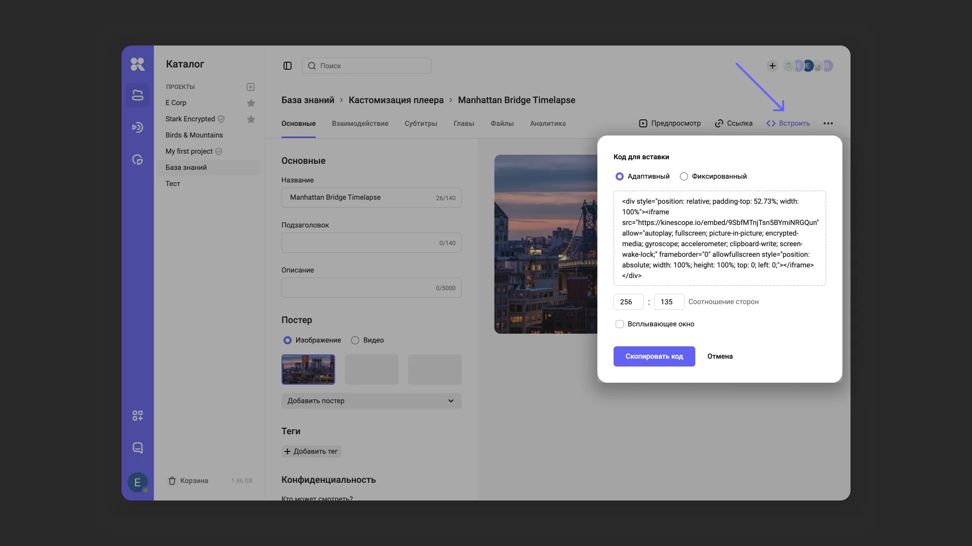 Больше о возможностях каталога читайте в статье «Организация медиатеки в Kinescope».