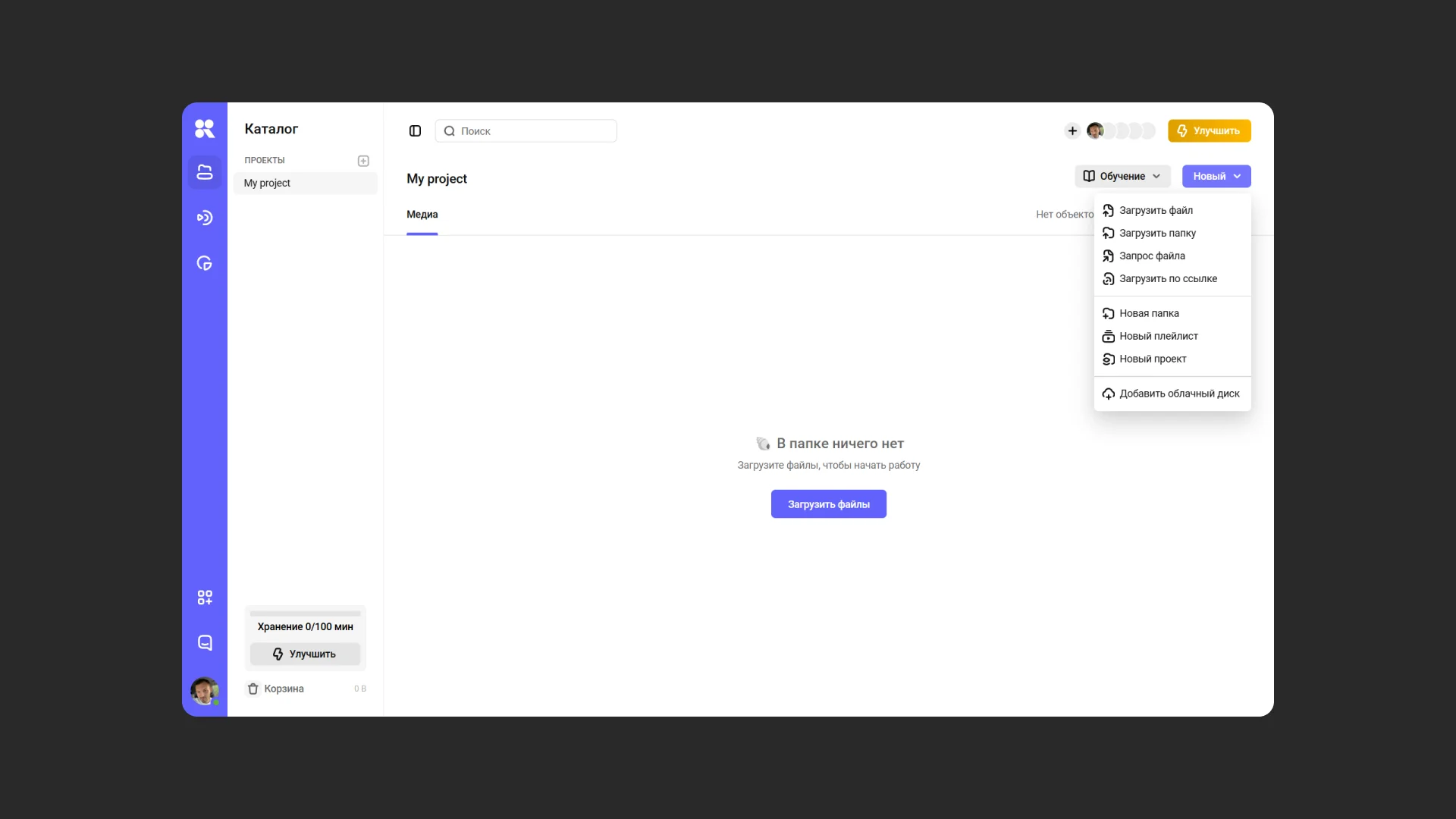 После входа в систему вы попадаете в Каталог, где находятся все проекты и медиафайлы. Чтобы начать работу: