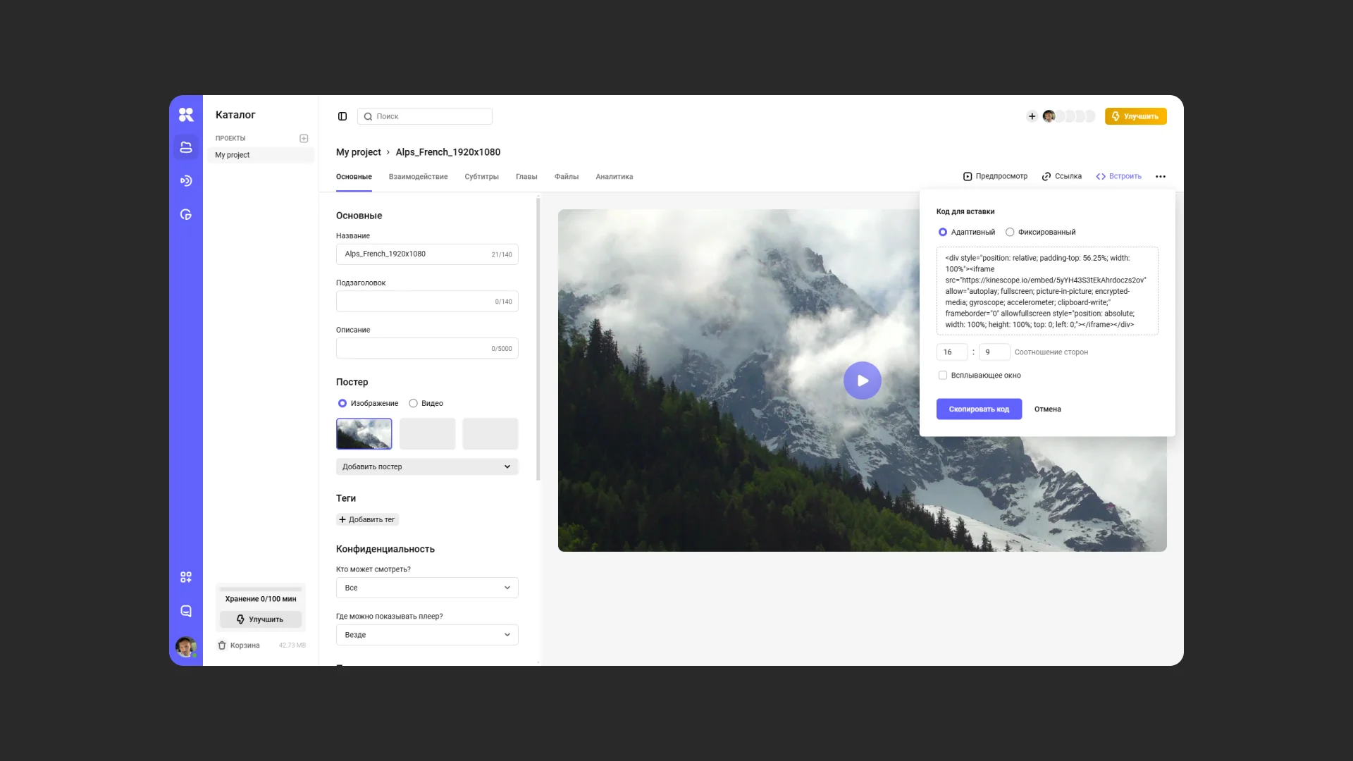 - Чтобы добавить постер к файлу, нажмите на кнопку «Добавить постер». Можно загрузить свою картинку или выбрать кадр вручную в плеере справа. Если пропустить этот шаг, Kinescope выберет постер автоматически.